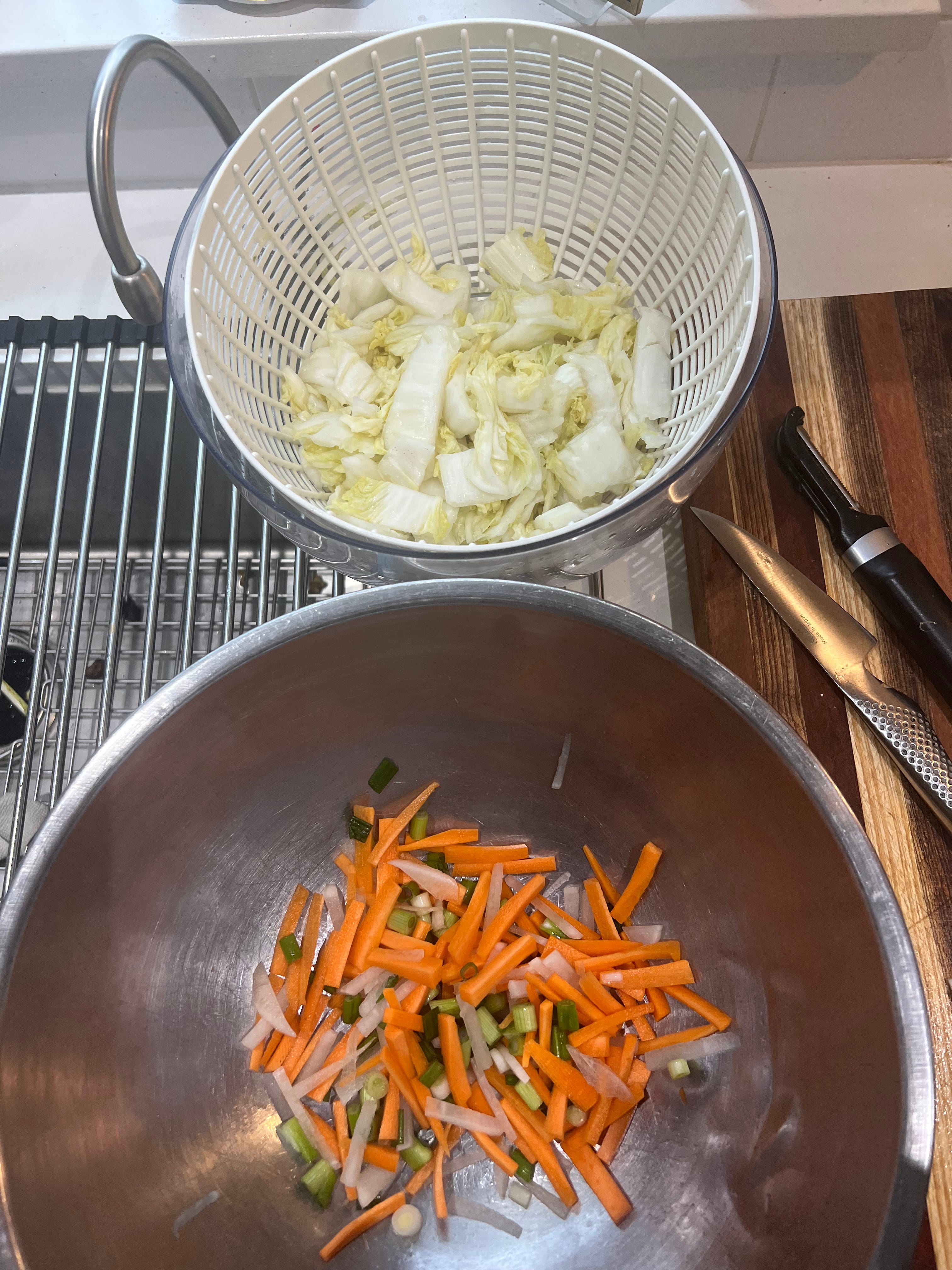 The Savoy cabbage is chopped & soaked for 2 hours then drained in a colander. You can see some green onions are in the other bowl with a carrot & daikon cut into strips. I made a paste of garlic, ginger, sugar, salt & gochugau paste. I made a mistake & used gochojang paste instead of gochugau paste. I was wondering why it did not look red once it was mixed together. The kimchi looks orange & now I am reading to add paprika if substituting gochojang for gochugau! Hopefully the kimchi will taste ok! I will let you know! The cabbage mixture is put into sterilized jars and then left to sit on the counter for 2 days at which time the kimchi is checked to see if it has fermented enough! If it is the taste we want then the kimchi is stored in the fridge for up to 3 months! I am going to put a date on the jars so I remember when it was made!